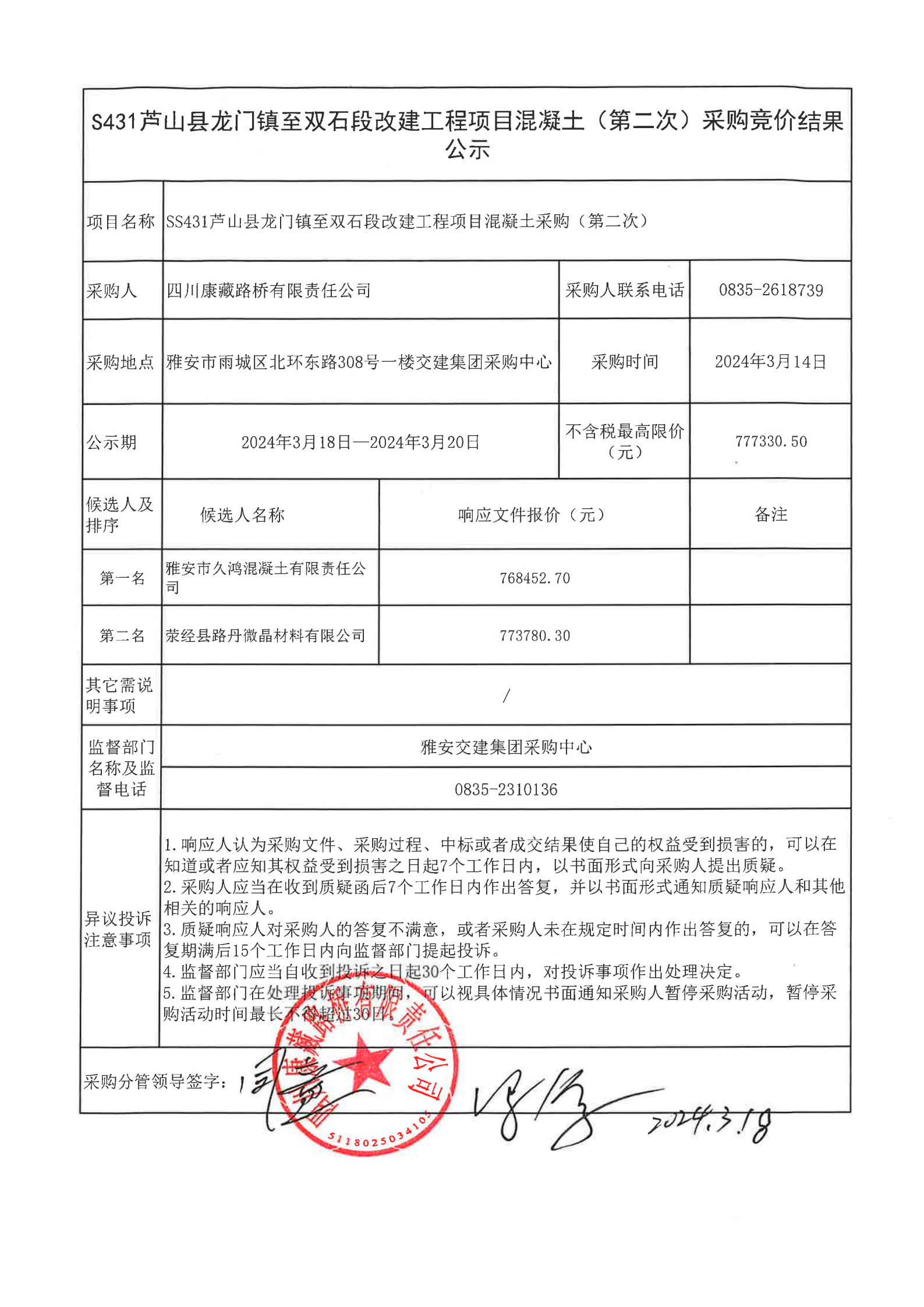 四川康藏路桥有限责任公司S431芦山县龙门镇至双石段改建工程项目混凝土(第二次)采购竞价结果公示