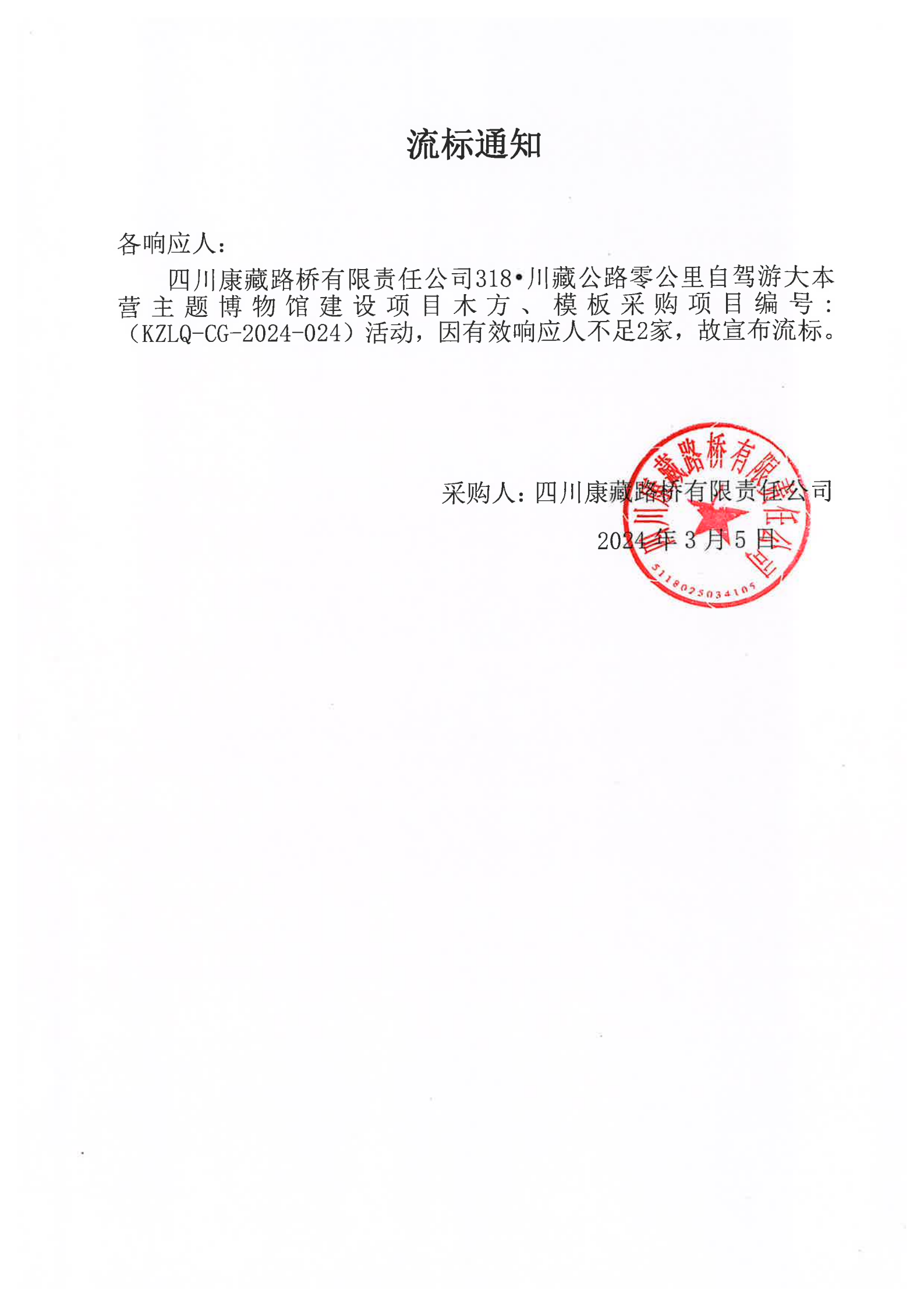 四川康藏路桥有限责任公司318·川藏公路零公里自驾游大本营主题博物馆建设项目木方、模板采购流标通知