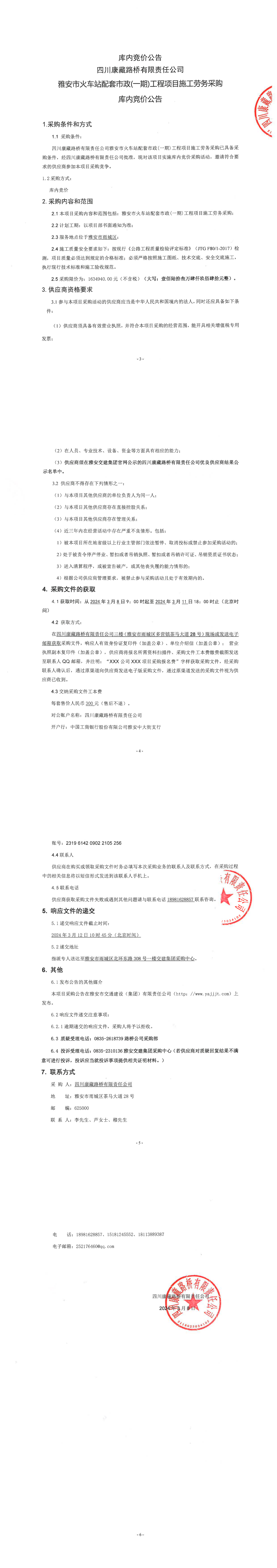 四川康藏路桥有限责任公司雅安市火车站配套市政(一期)工程项目施工劳务采购库内竞价公告