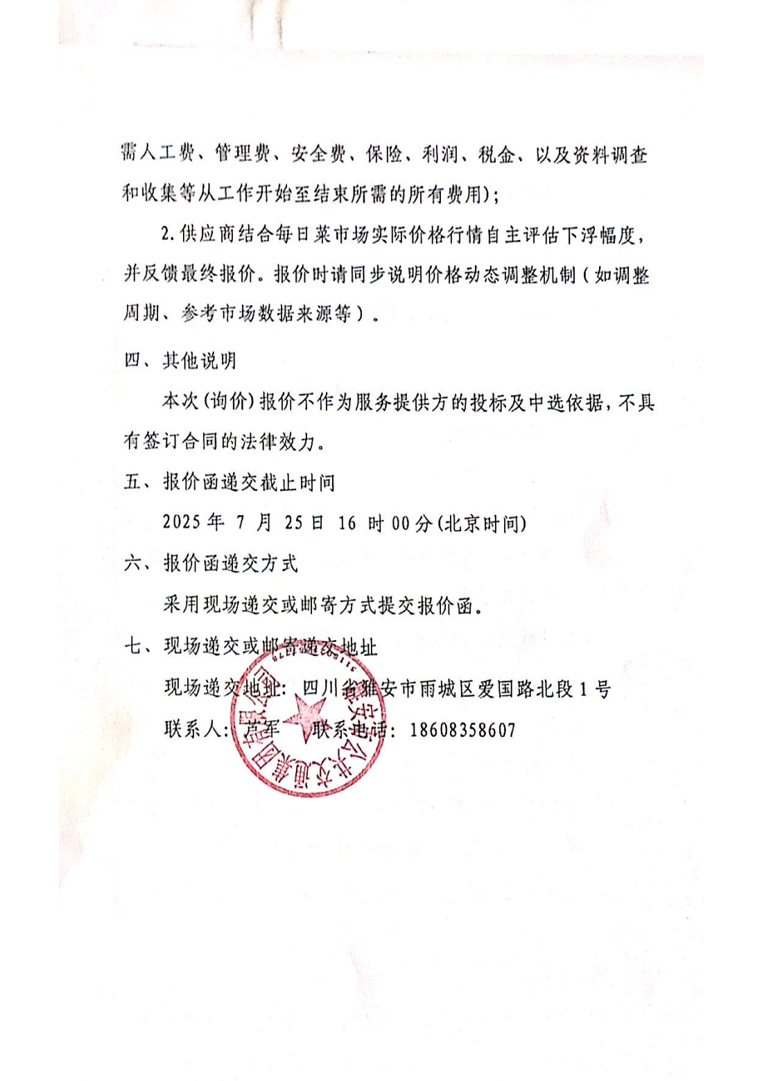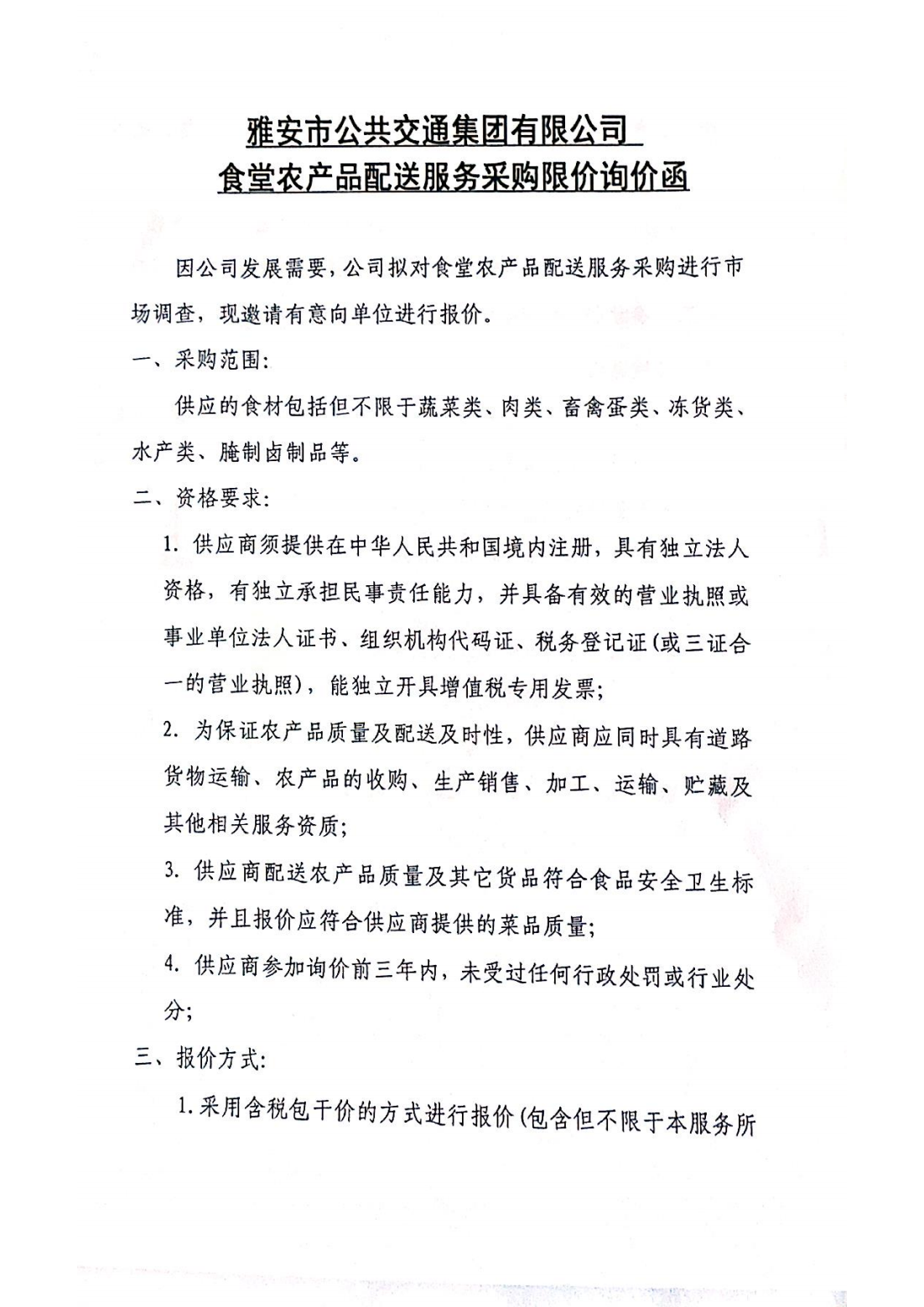 关于雅安市公共交通集团有限公司食堂农产品配送服务采购限价的询价函