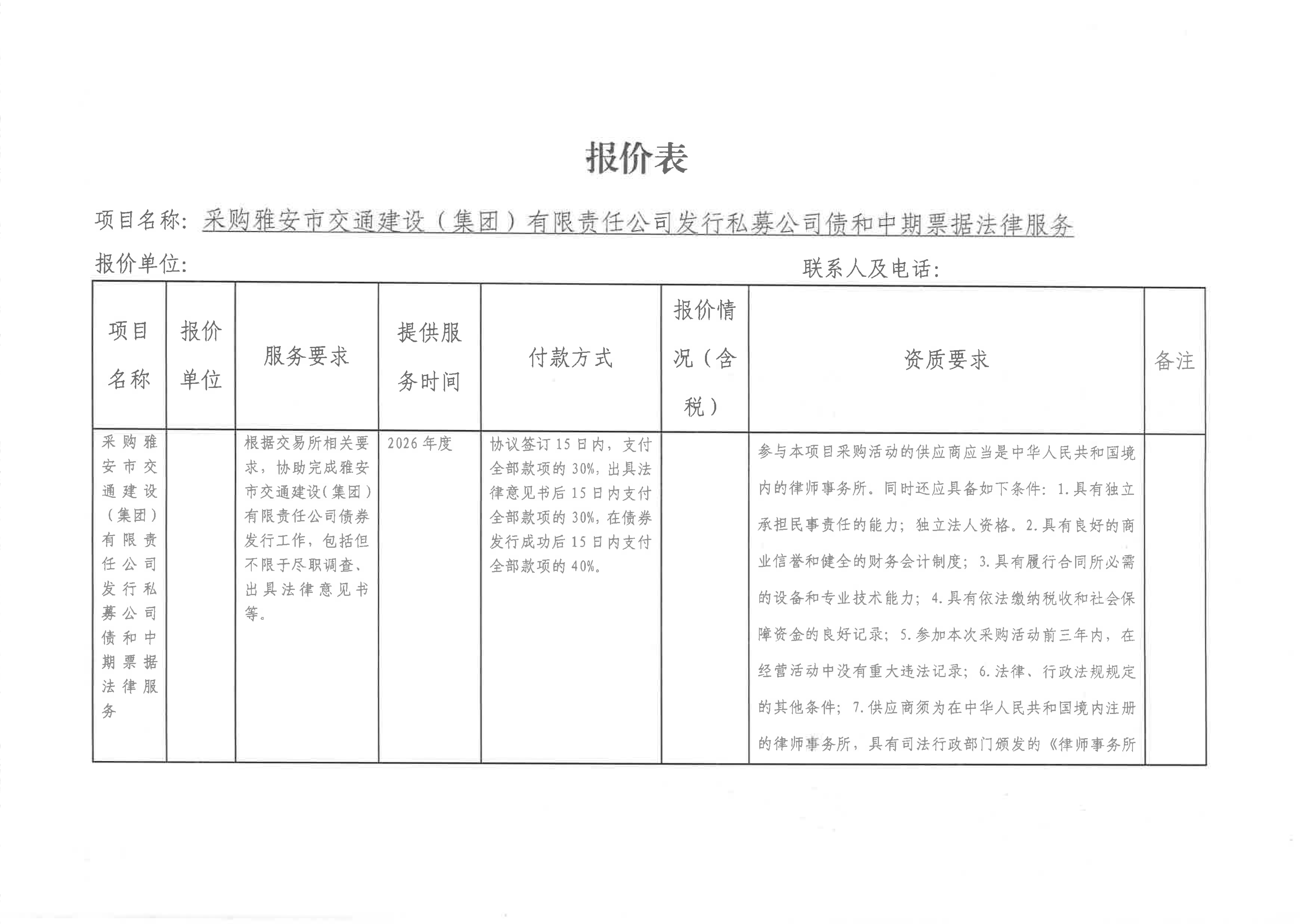 关于雅安市交通建设(集团)有限责任公司发行私募公司债和中期票据所需法律服务采购限价的询价函