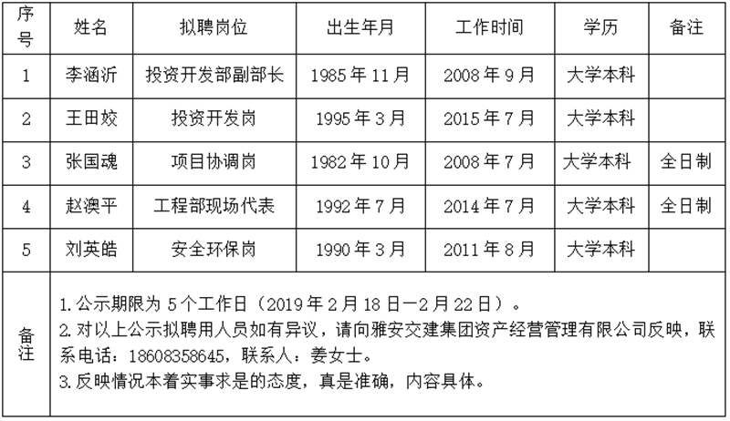 5名拟聘用人员予以公示: