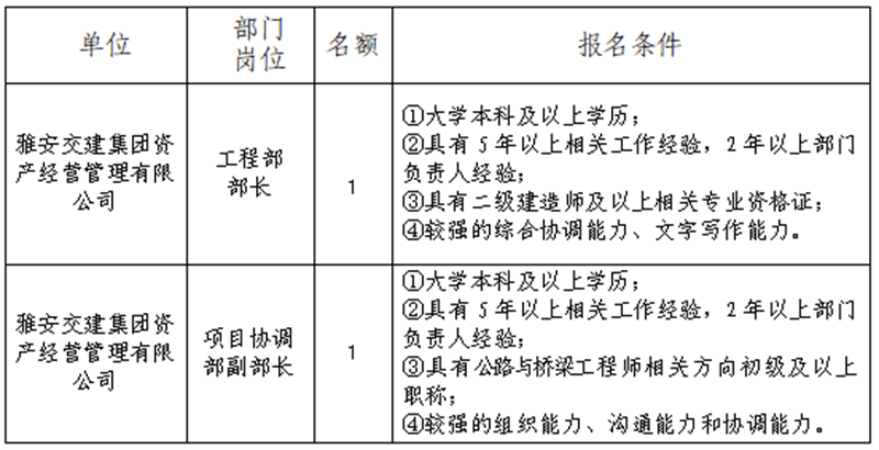 根据开展需要,决定面向社会公开招聘雅安市交通建设(集团)有限责任公司(以下简称“亿万先生MR集团”)所属子公司工作人员2名,现将有关事项公告如下: