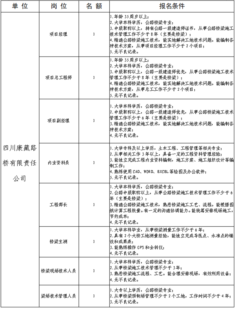 四川康藏路桥有限责任公司关于公开招聘省道104线草坝至姚桥段改建项目部工作人员的公告