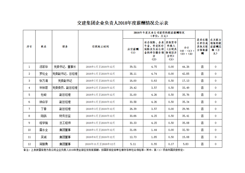 交建集团企业负责人2018年度薪酬情况公示表