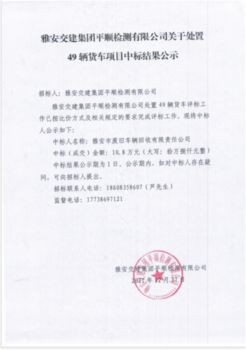 亿万先生MR集团平顺检测公司关于处置49辆货车项目中标结果公示