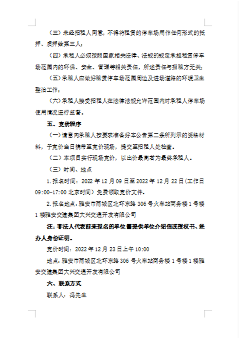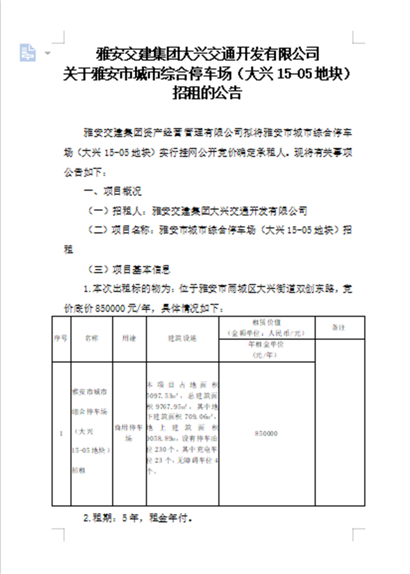 亿万先生MR集团大兴交通开发有限公司关于雅安市城市综合停车场(大兴15-05地块)招租的公告