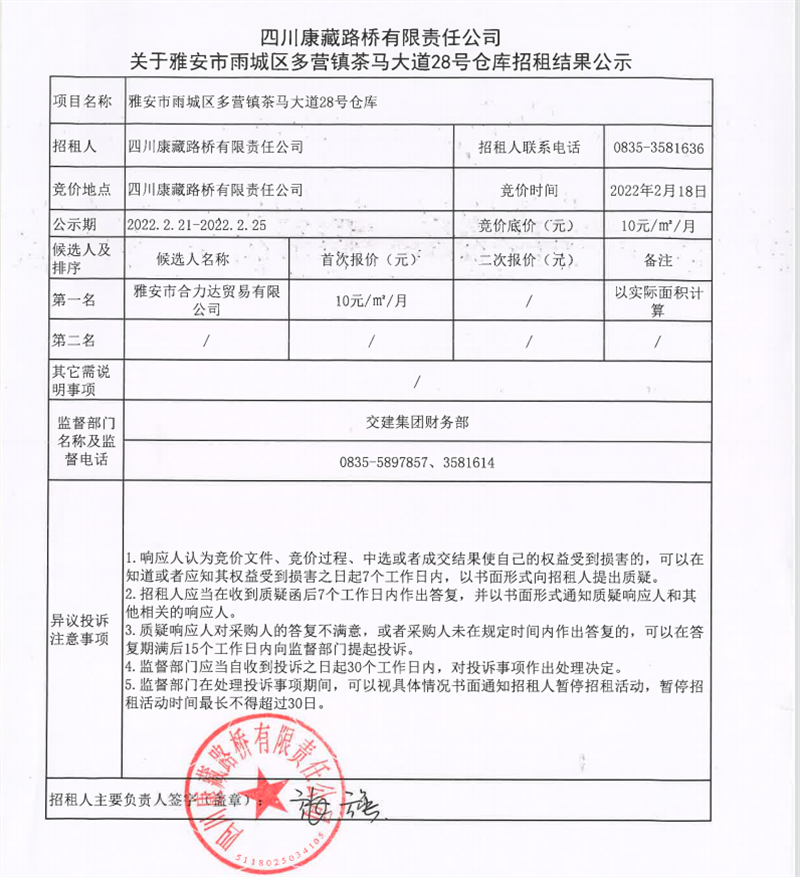 四川康藏路桥有限责任公司关于雅安市雨城区多营镇茶马大道28号仓库招租结果的公示