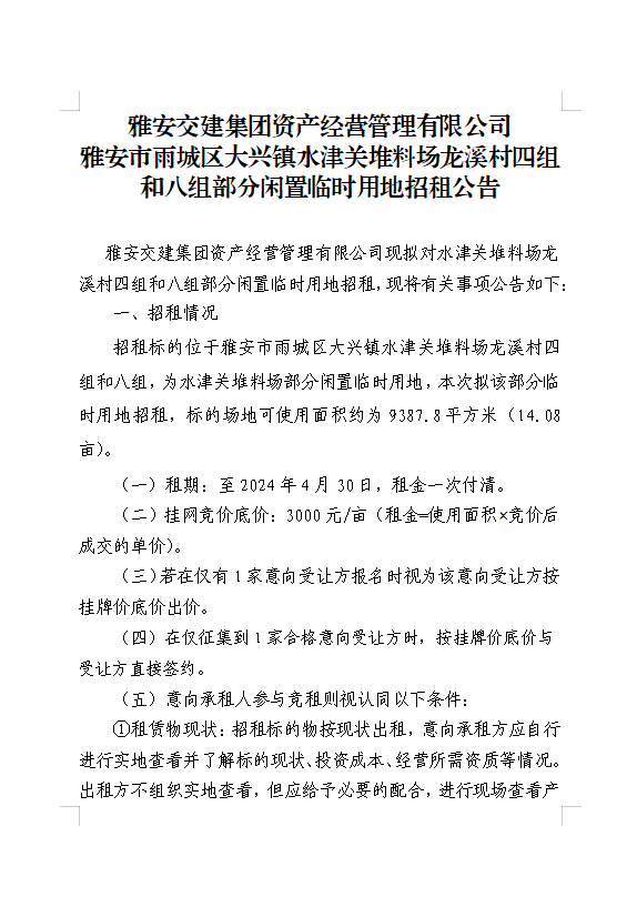 亿万先生MR集团资产经营管理有限公司雨城区大兴镇水津关堆料场龙溪村四组和八组部分闲置临时用地招租公告
