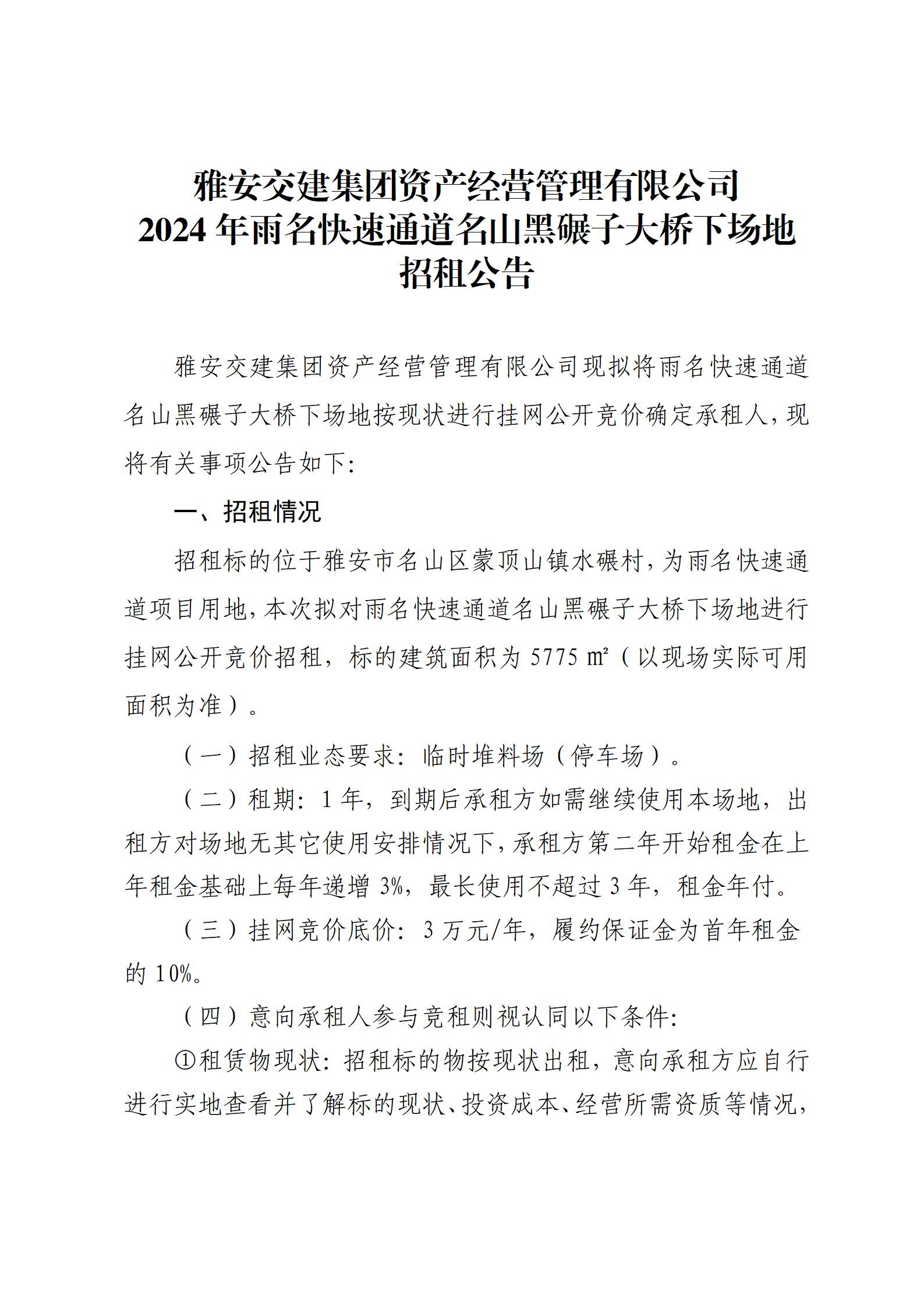 亿万先生MR集团资产经营管理有限公司2024年雨名快速通道名山黑碾子大桥下场地招租公告