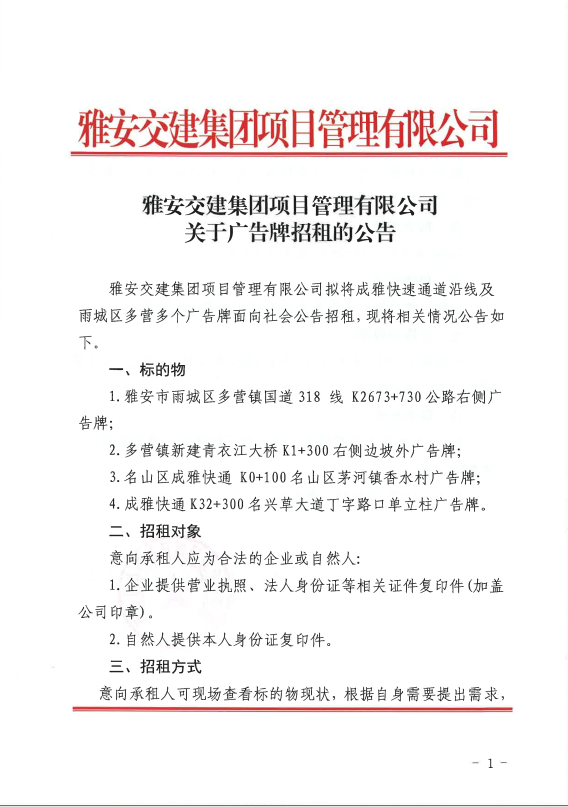 亿万先生MR集团项目管理有限公司关于广告牌招租的公告