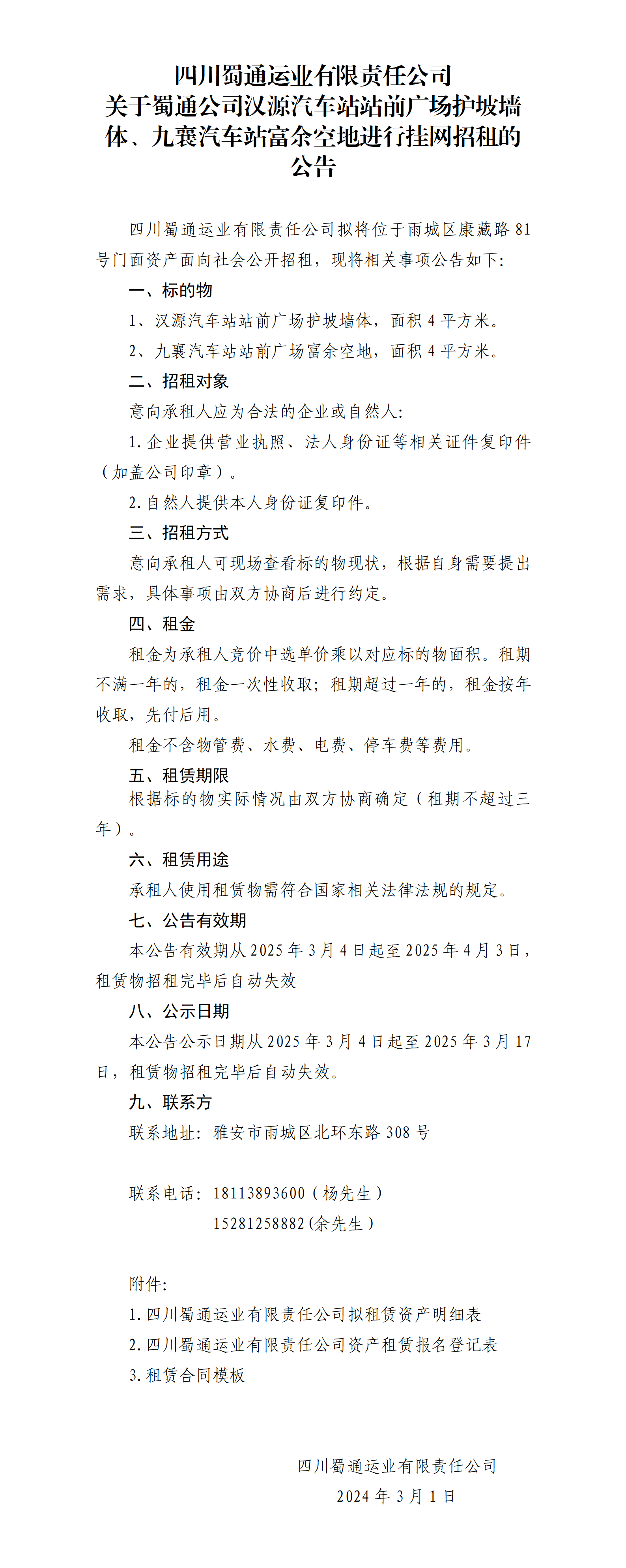 四川蜀通运业有限责任公司 关于蜀通公司汉源汽车站站前广场护坡墙体、九襄汽车站富余空地进行挂网招租的公告
