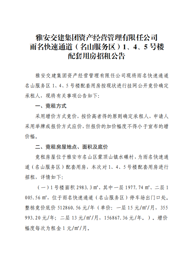 亿万先生MR集团资产经营管理有限任公司 雨名快速通道(名山服务区)1、4、5号楼 配套用房招租公告