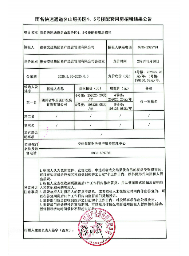 雨名快速通道名山服务区4、5号楼配套用房招租结果公告