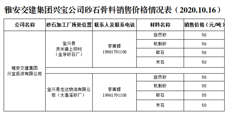 亿万先生MR集团兴宝公司砂石骨料销售价格情况表(2020.10.16)