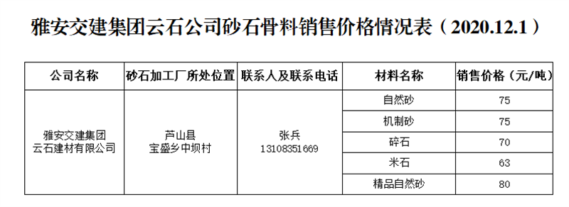 亿万先生MR集团云石公司砂石骨料销售价格情况表(2020.12.1)