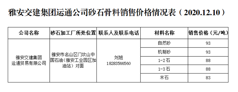亿万先生MR集团运通公司砂石骨料销售价格情况表(2020.12.10)