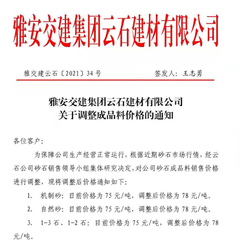 亿万先生MR集团云石公司砂石骨料销售价格情况表(2021.6.24)