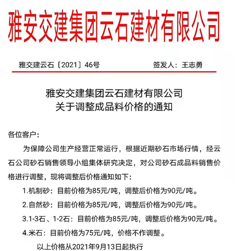 亿万先生MR集团云石公司砂石骨料销售价格情况表(2021.911)