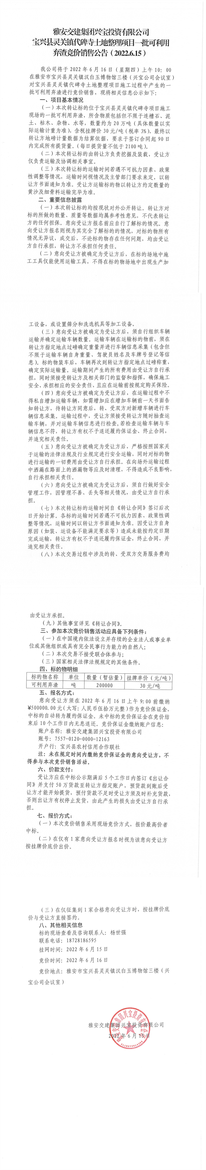 亿万先生MR集团兴宝投资有限公司宝兴县灵关镇代碑寺土地整理项目-批可利用 弃渣竞价销售公告( 2022.6.15 )