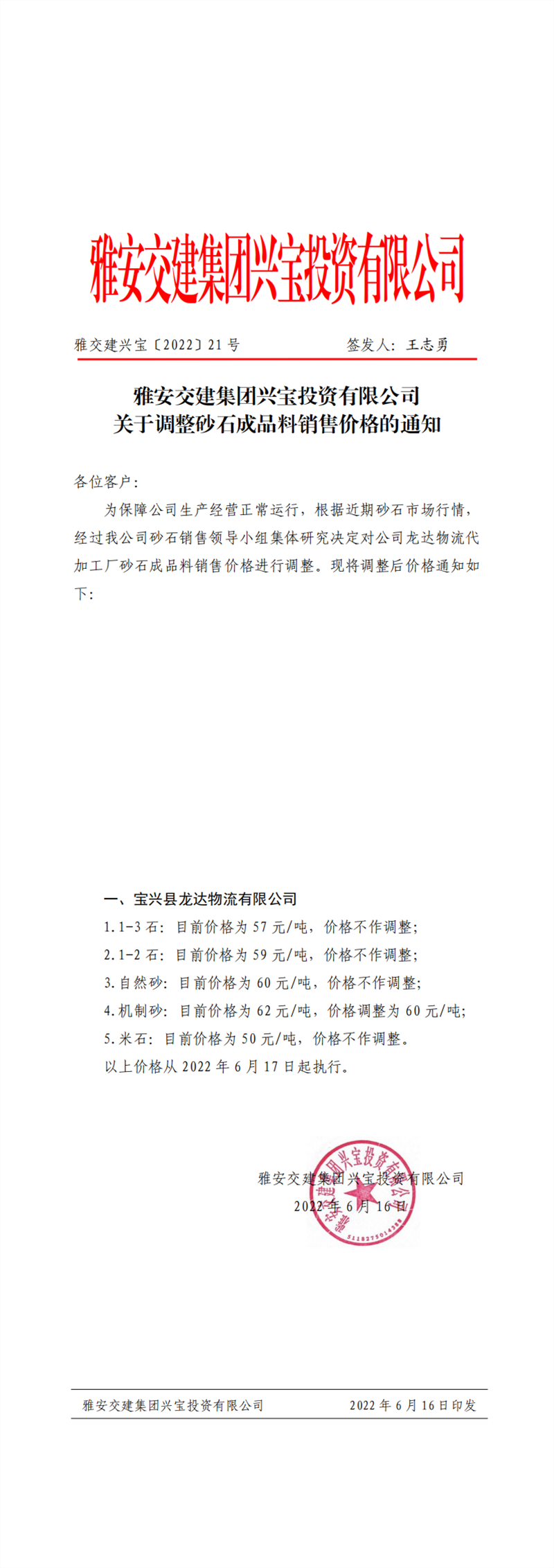 亿万先生MR集团兴宝投资有限公司 关于调整砂石成品料销售价格的通知(2022.6.16)