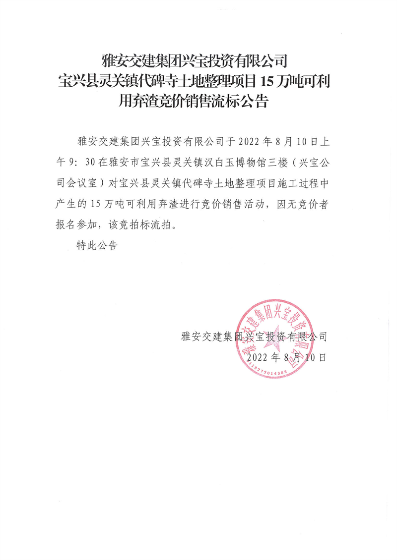 亿万先生MR集团兴宝投资有限公司灵关镇代碑寺土地整理项目15万吨可利用弃渣竞价销售流标公告