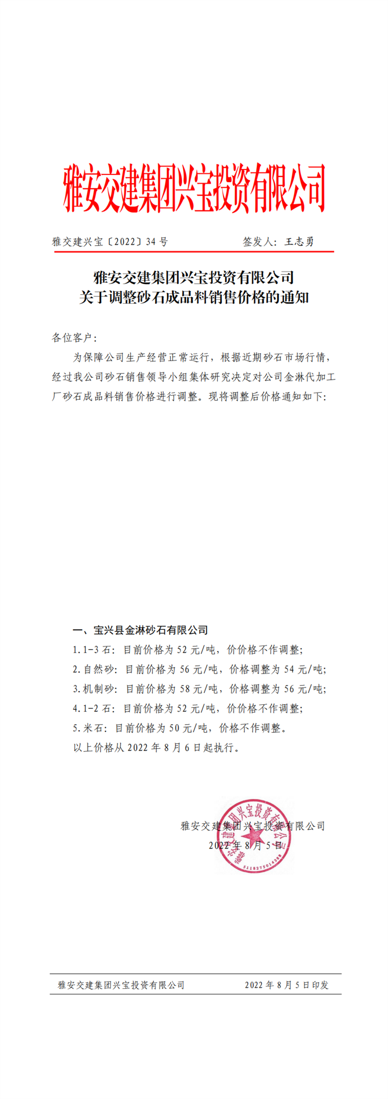 雅交建兴宝〔2022〕34号 关于调整砂石成品料销售价格的通知
