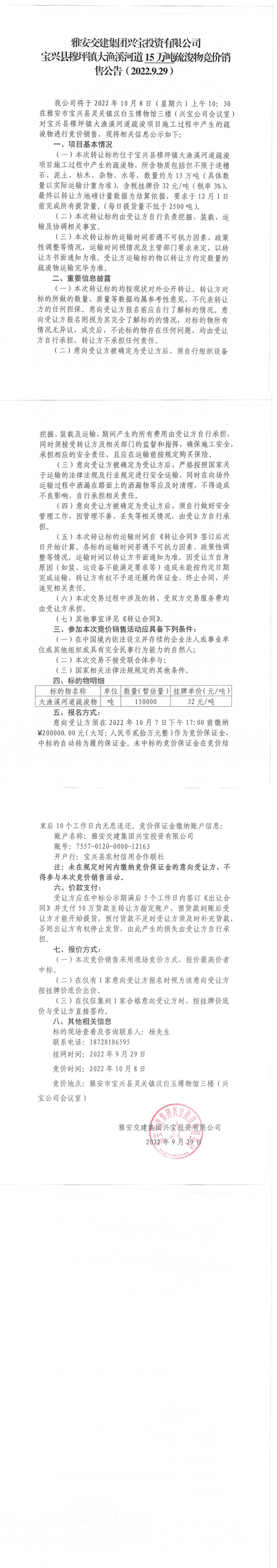 亿万先生MR集团兴宝投资有限公司宝兴县穆坪镇大渔溪河道15万吨疏浚物竞价销售公告(2022.9.29)
