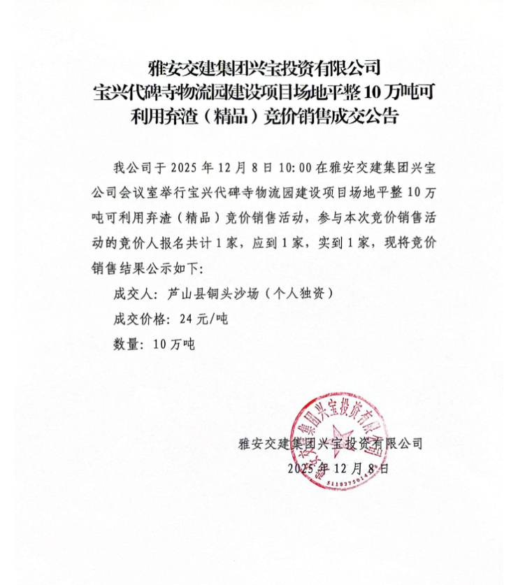 兴宝投资有限公司宝兴代碑专卖店物流园建设项目场地平整10万吨可利用弃渣(精品)总价销售成效公告(2025.12.08)